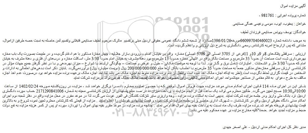 ،به موجب دادنامه شماره 960997040460023مورخه1396/01/26صادره از شعبه ششم دادگاه عمومی حقوقی اردبیل مبنی برتقسیم  ماترک مرحوم لطیف صنایعی قنبلانی وتقسیم ثمن حاصله به نسبت حصه طرفین ازاموال مشاعی که پس ازارجاع امربه کارشناس رسمی دادگستری به شرح ذیل ارزیابی و واعلام گردیده است.