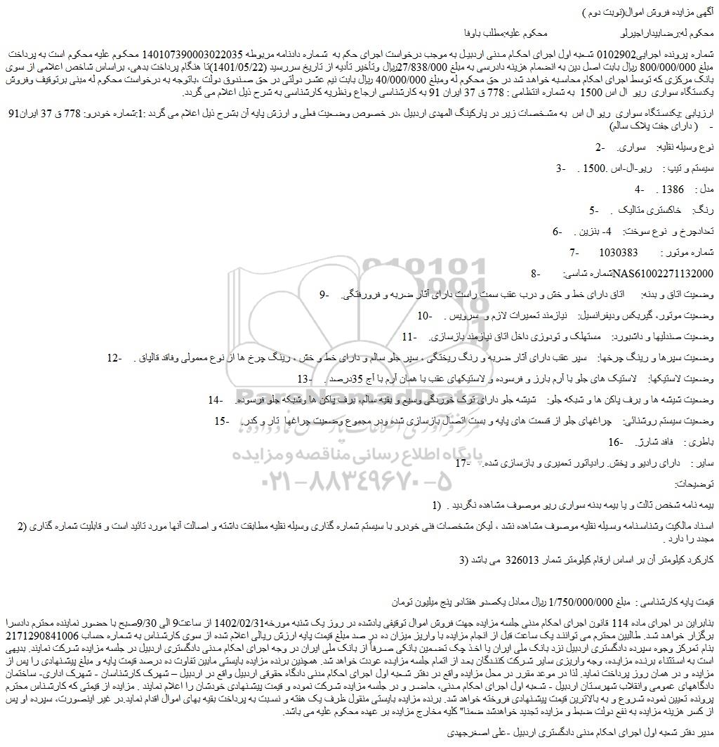 شماره پرونده اجرایی0102902 شعبه اول اجرای احکام مدنی اردبیل به موجب درخواست اجرای حکم به شماره دادنامه مربوطه 140107390003022035 محکوم علیه محکوم است به پرداخت مبلغ 800/000/000 ریال بابت اصل دین به انضمام هزینه دادرسی به مبلغ 27/838/000ریال وتأخیر تأدیه از تاریخ سررسید (1401/05/22)تا هنگام پرداخت بدهی، براساس شاخص اعلامی از سوی بانک مرکزی که توسط اجرای احکام محاسبه خواهد شد در حق محکوم له ومبلغ 40/000/000 ریال بابت نیم عشر دولتی در حق صندوق دولت ،باتوجه به درخواست محکوم له مبنی برتوقیف وفروش یکدستگاه سواری ریو ال اس 1500 به شماره انتظامی : 778 ق 37 ایران 91 به کارشناسی ارجاع ونظریه کارشناسی به شرح ذیل اعلام می گردد.