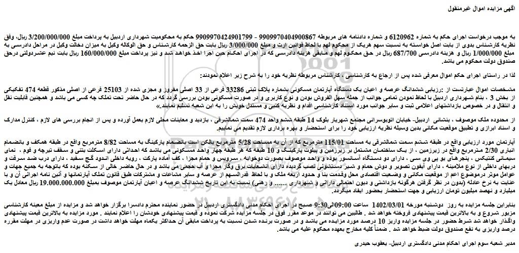 مشخصات اموال عبارتست از :رزیابی ششدانگ عرصه و اعیان یک دستگاه آپارتمان مسکونی بشماره پلاک ثبتی 33286 فرعی از 33 اصلی مفروز و مجزی شده از 25103 فرعی از اصلی مذکور قطعه 474 تفکیکی از بخش 3 ، بنام شهرداری اردبیل با لحاظ نمودن تمامی جوانب از جمله سهل الفروش بودن و نوع کاربری و در صورت مسکونی بودن بررسی گردد که در حال حاضر تحت تملک چه کسی می باشد و همچنین قابلیت نقل و انتقال و در خصوص بازداشتهای اعلامی ثبت و سایر جوانب مورد استناد کارشناسی اقدام و نظریه کتبی و مستدل خویش را به این شعبه تسلیم نمایند.»