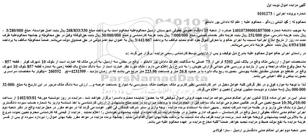 مشخصات اموال : ارزیابی ملک واقع در پلاک ثبتی 5202 فرعی از 73 اصلی به مالکیت علم الله داداش پور دابانلو ، واقع در بخش سه اردبیل، به آدرس ملک که عبارت است از بلوک 10 شهرک کوثر - قطعه 857 ، به محل وقوع ملک مراجعه و پس از بازدید و بررسی های میدانی گزارش خویش را به شرح زیل اعلام می دارم : ملک مورد نظر عبارت است از سه دانگ مشاع یک قطعه زمین به شماره قطعه 857 بلوک 10 شهرک کوثر به مختصات سراسری x= 260552 و y=4231599 ، واقع در تقاطع دو خیابان مطابق نقشه پیوستی ،بصورت ربع یک دایره با بر حدود 26.8 متر و مساحت 223.96 متر مربع می باشد که در زمان بازدید بصورت بیاض و فاقد اعیانی می باشد.