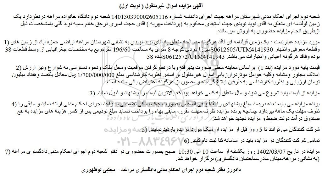 شعبه دوم اجرای احکام مدنی شهرستان مراغه جهت اجرای دادنامه شماره 140130390002605116 شعبه دوم دادگاه خانواده مراغه درنظردارد یک زمین قولنامه ای متعلق به آقای نوید نویدی جهت استیفای محکوم به (پرداخت مهریه ) آقای حجت امیری درحق خانم سمیه نوید گلی بامشخصات ذیل ازطریق انجام مزایده حضوری به فروش میرساند: