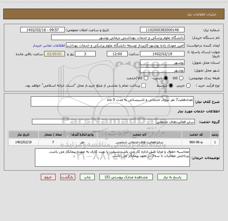 شرح کلی نیاز: تعدادهفت7 نفر نیروی خدماتی و تاسیساتی به مدت 5 ماه