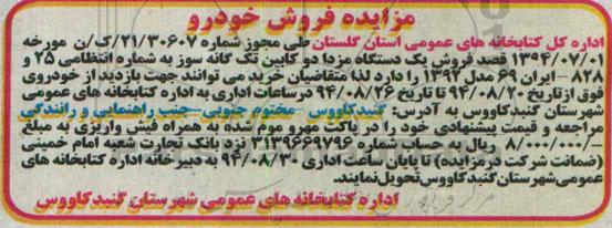 لذا متقاضیان خرید می توانند جهت بازدید از خودروی فوق از تاریخ 94.8.20 تا تاریخ 94.8.26 در ساعات اداری به اداره کتابخانه های عمومی شهرستان گنبد کاووس به آدرس: گنبد کاووس- مختوم جنوبی جنب راهنمایی و رانندگی مراجعه و قیمت پیشنهادی خود را در پاکت مهر و موم شده به همراه فیش واریزی به مبلغ 8.000.000 ریال به حساب شماره 3139669796 نزد بانک تجارت شعبه امام خمینی (ضمانت شرکت در مزایده) تا پایان ساعت اداری 94.8.30 به دبیرخانه اداره کتابخانه های عمومی شهرستان گنبدکاووس تحویل نمایند