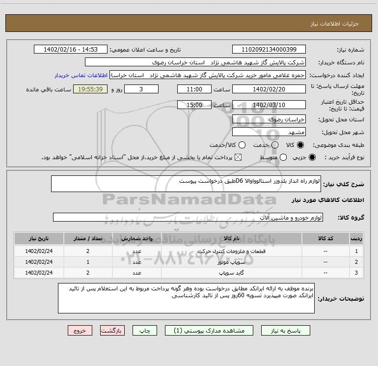 نام دستگاه خریدار:شرکت پالایش گاز شهید هاشمی نژاد استان خراسان رضوی
