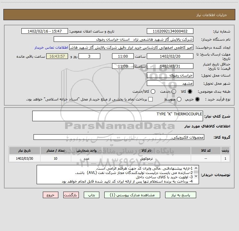 نام دستگاه خریدار:شرکت پالایش گاز شهید هاشمی نژاد استان خراسان رضوی