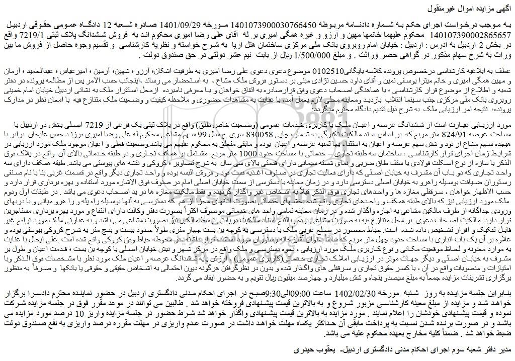 به موجب درخواست اجرای حکم به شماره دادنامه مربوطه 1401073900030766450 مورخه 1401/09/29 صادره شعبه 12 دادگاه عمومی حقوقی اردبیل  140107390002865657  محکوم علیهما خانمها مهین و آرزو و غیره همگی امیری بر له  آقای علی رضا امیری محکوم اند به  فروش ششدانگ پلاک ثبتی 7219/1 واقع در بخش 2 اردبیل به آدرس : اردبیل : خیابان امام روبروی بانک ملی مرکزی ساختمان هتل آریا  به شرح خواسته و نظریه کارشناسی  و تقسیم وجوه حاصل از فروش ما بین وراث به شرح سهام مذکور در گواهی حصر وراثت . و مبلغ 1/500/000 ریال از بابت  نیم عشر دولتی در حق صندوق دولت .
