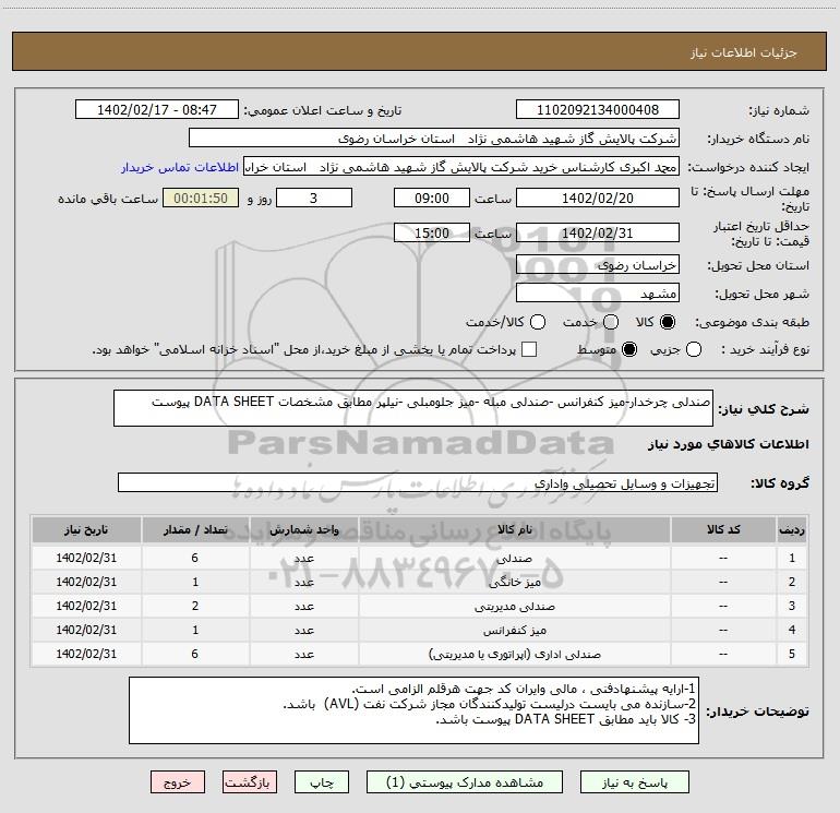 نام دستگاه خریدار:شرکت پالایش گاز شهید هاشمی نژاد استان خراسان رضوی