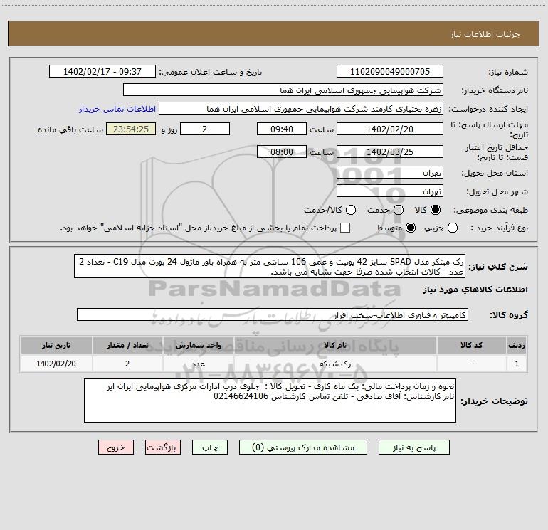 شرح کلی نیاز: رک مبتکر مدل SPAD سایز 42 یونیت و عمق 106 سانتی متر به همراه پاور ماژول 24 پورت مدل C19 - تعداد 2 عدد - کالای انتخاب شده صرفا جهت تشابه می باشد.