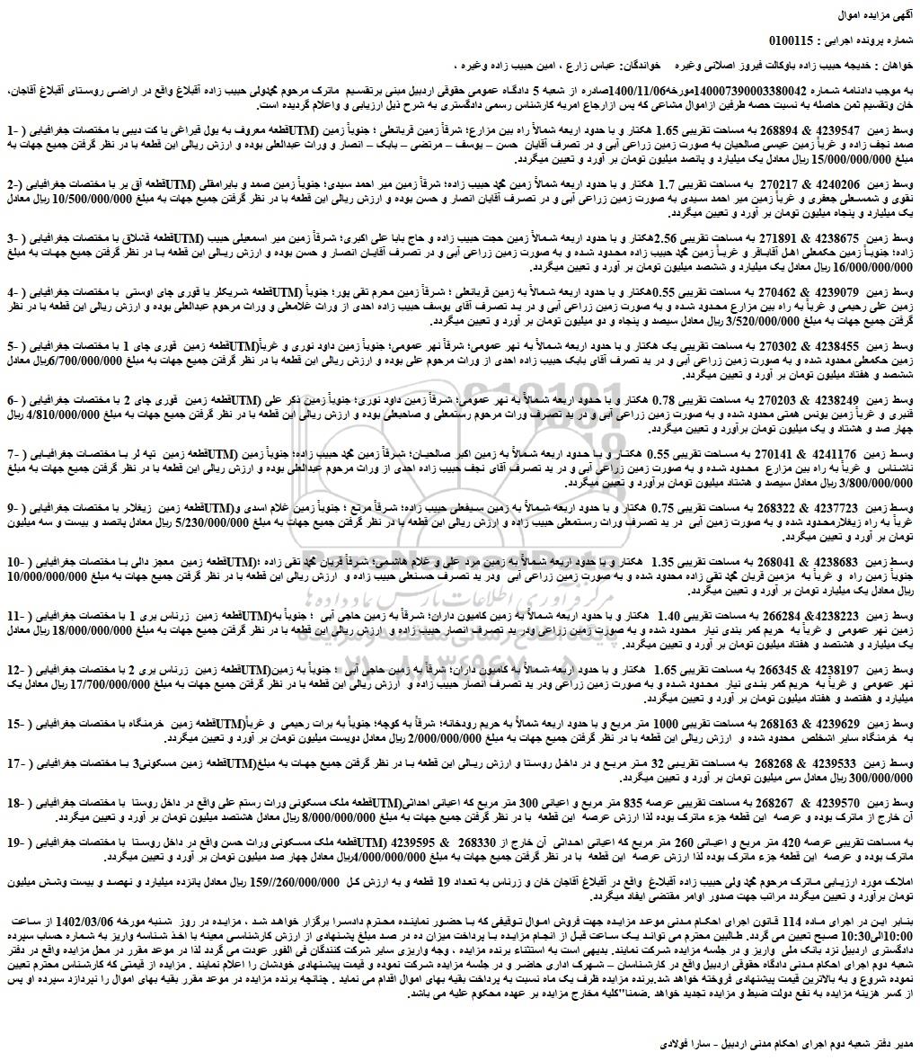 ،به موجب دادنامه شماره 140007390003380042مورخه1400/11/06صادره از شعبه 5 دادگاه عمومی حقوقی اردبیل مبنی برتقسیم  ماترک مرحوم محمدولی حبیب زاده آقبلاغ واقع در اراضی روستای آقبلاغ آقاجان خان وتقسیم ثمن حاصله به نسبت حصه طرفین ازاموال مشاعی که پس ازارجاع امربه کارشناس رسمی دادگستری به شرح ذیل ارزیابی و واعلام گردیده است.