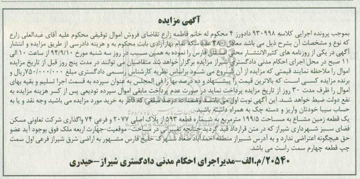 مزایده:94.9.10 ساعت ده الی11 صبح