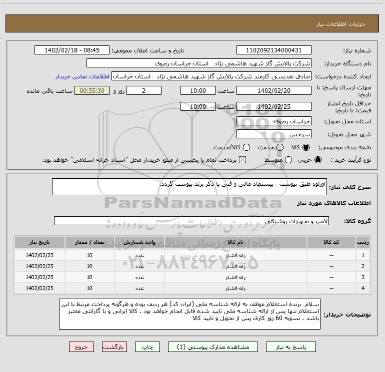 نام دستگاه خریدار:شرکت پالایش گاز شهید هاشمی نژاد استان خراسان رضوی
