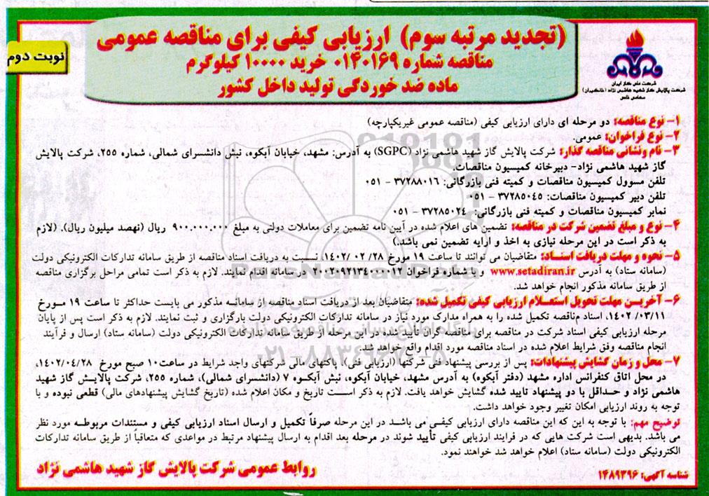 تجدید مرتبه سوم-ارزیابی کیفی برای مناقصه عمومی مناقصه شماره 0140169 خرید 10000 کیلوگرم ماده ضد خوردگی تولید داخل کشور