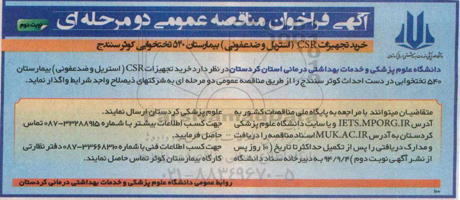 دانشگاه علوم پزشکی و خدمات بهداشتی درمانی استان کردستان در نظر دارد خرید تجهیزات CSR استریل و ضدعفونی بیمارستان 540 تختخوابی در دست احداث کوثر سنندج را از طریق مناقصه عمومی دو مرحله ای به شرکتهای ذیصلاح واجد شرایط واگذار نماید.