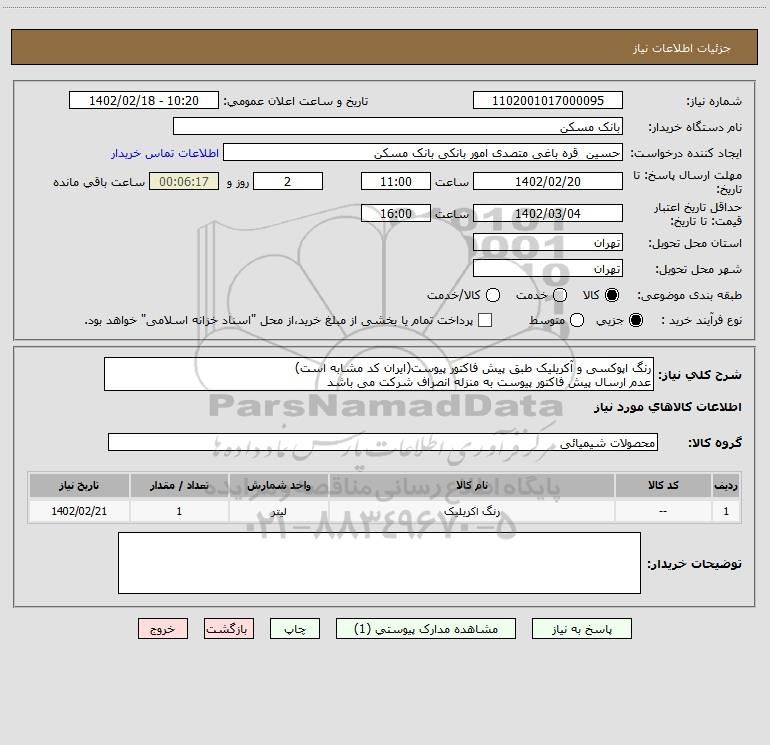 استعلام رنگ اپوکسی و آکریلیک طبق پیش فاکتور پیوست(ایران کد مشابه است) عدم ارسال پیش فاکتور پیوست به منزله انصراف شرکت می باشد, استعلام رنگ اپوکسی و آکریلیک طبق پیش فاکتور پیوست(ایران کد مشابه است) عدم ارسال پیش فاکتور پیوست به منزله انصراف شرکت می باشد