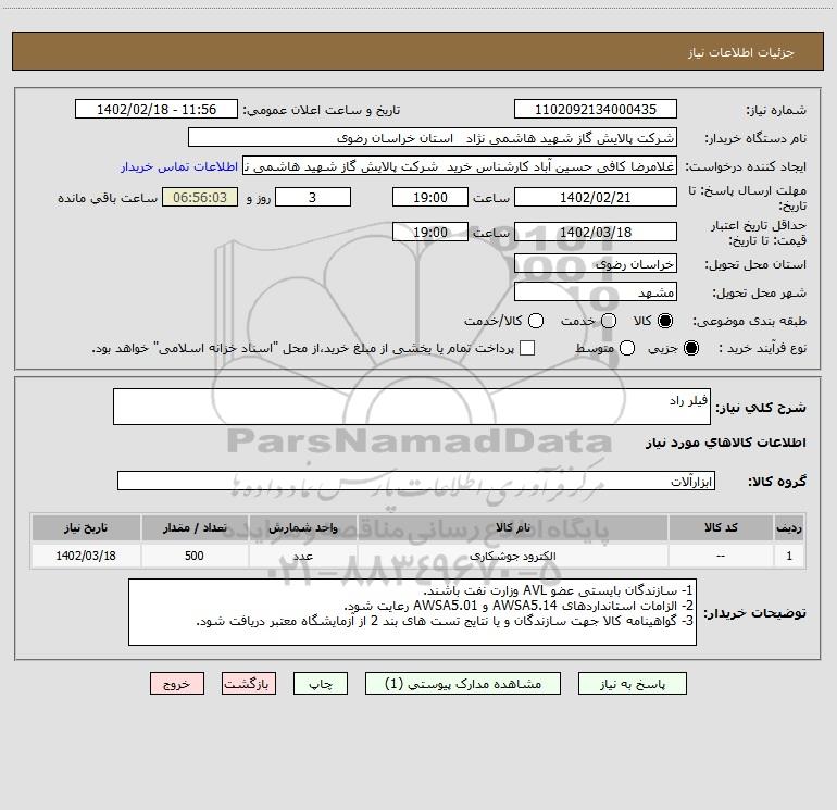 نام دستگاه خریدار:شرکت پالایش گاز شهید هاشمی نژاد استان خراسان رضوی