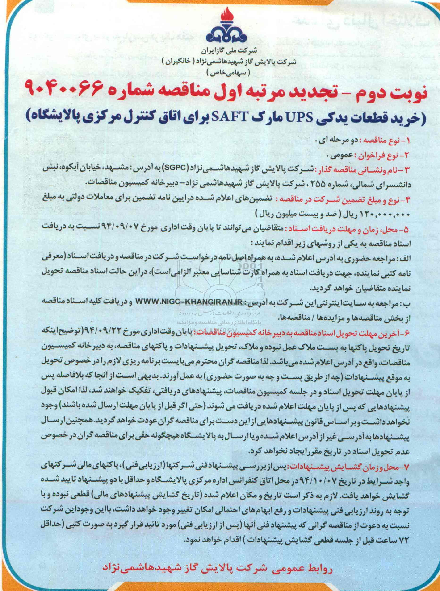 تجدید مناقصه خرید قطعات یدکی UPS مارک SAFT برای اتاق کنترل مرکزی پالایشگاه نوبت دوم - تجدید مرتبه اول, تجدید مناقصه , تجدید مناقصه خرید قطعات یدکی UPS مارک SAFT برای اتاق کنترل مرکزی پالایشگاه نوبت دوم تجدید مرتبه اول