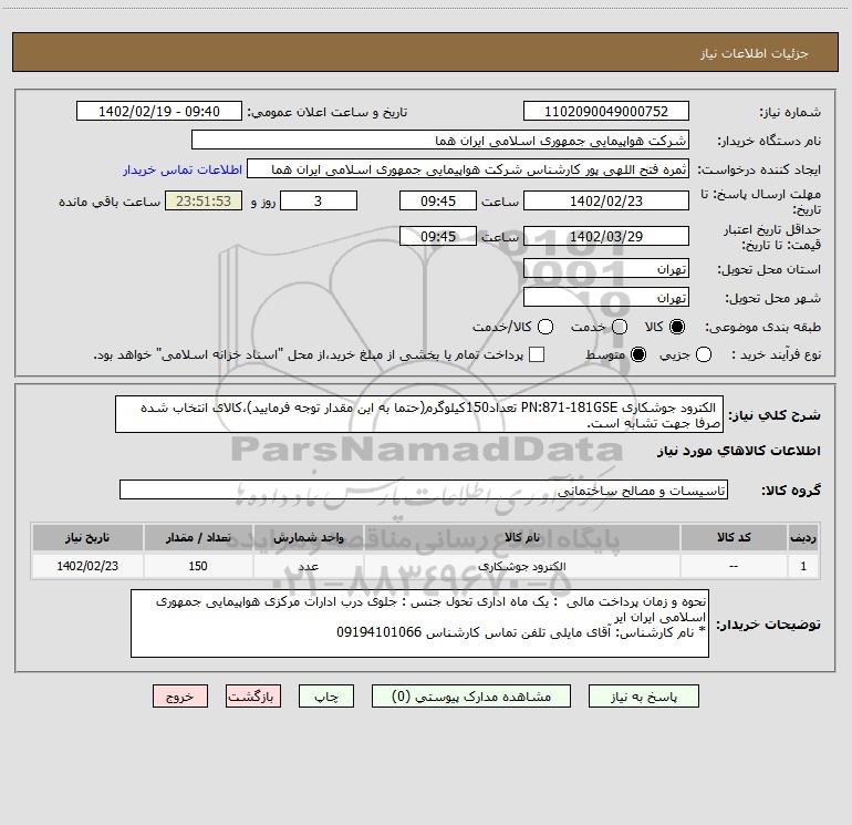 شرح کلی نیاز: الکترود جوشکاری PN:871-181GSE تعداد150کیلوگرم(حتما به این مقدار توجه فرمایید)،کالای انتخاب شده صرفا جهت تشابه است.