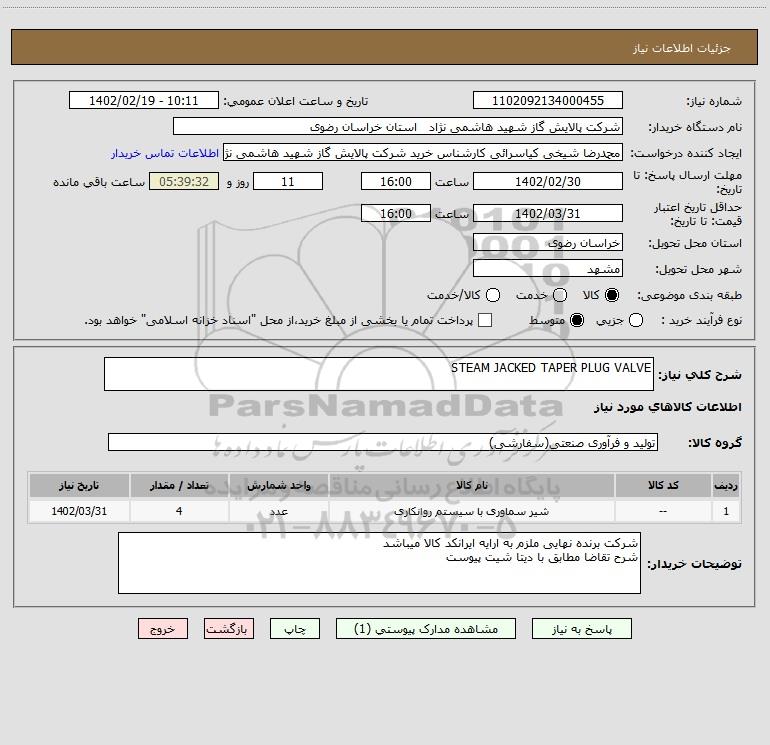 شرح کلی نیاز: STEAM JACKED TAPER PLUG VALVE