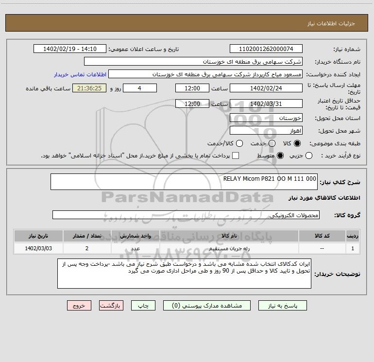شرح کلی نیاز: RELAY Micom P821 OO M 111 000