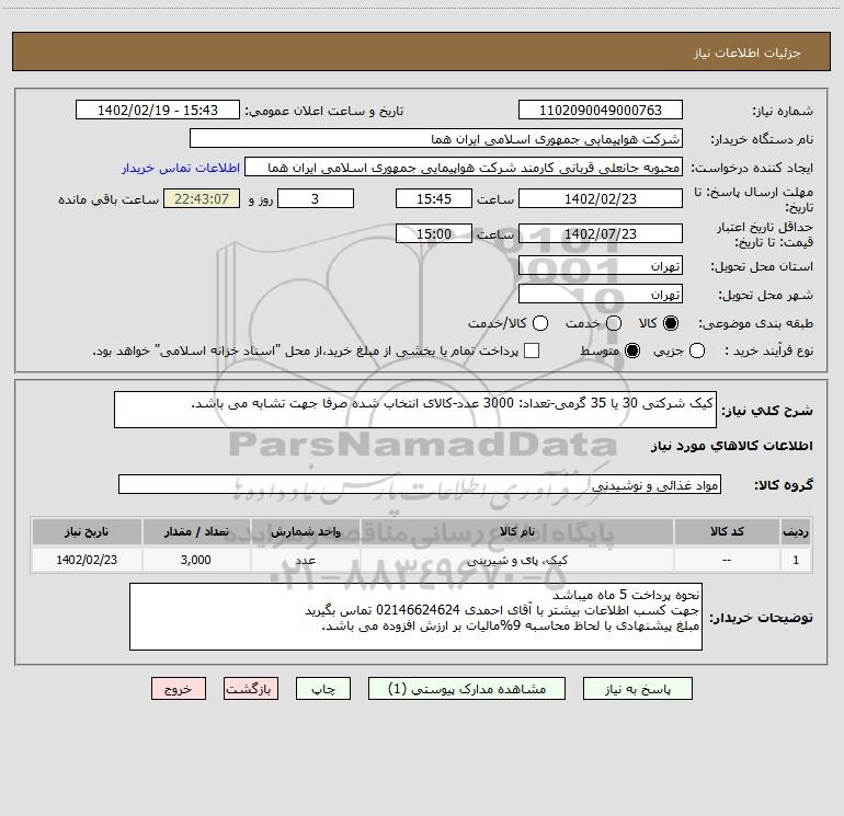 شرح کلی نیاز: کیک شرکتی 30 یا 35 گرمی-تعداد: 3000 عدد-کالای انتخاب شده صرفا جهت تشابه می باشد.