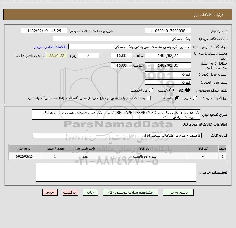 استعلام حمل و جابجایی یک دستگاه IBM TAPE LIBRARYY (طبق پیش نویس قرارداد پیوست)ارسال مدارک پیوست الزامی است ایران کد مشابه است, استعلام حمل و جابجایی یک دستگاه IBM TAPE LIBRARYY (طبق پیش نویس قرارداد پیوست)ارسال مدارک پیوست الزامی است ایران کد مشابه است