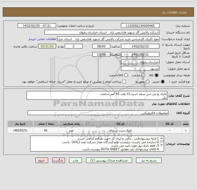 نام دستگاه خریدار:شرکت پالایش گاز شهید هاشمی نژاد استان خراسان رضوی