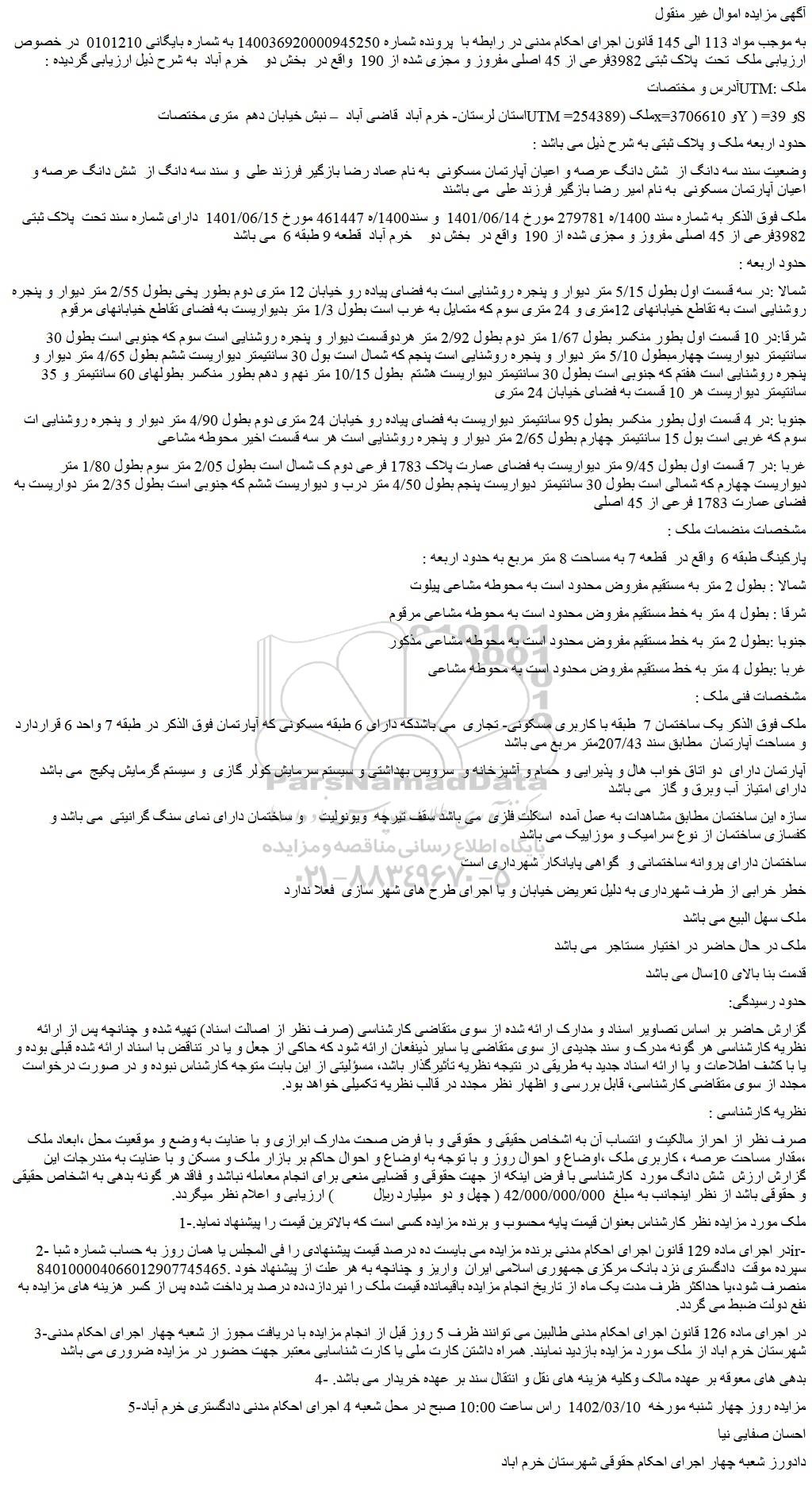 به موجب مواد 113 الی 145 قانون اجرای احکام مدنی در رابطه با پرونده شماره 140036920000945250 به شماره بایگانی 0101210 در خصوص ارزیابی ملک تحت پلاک ثبتی 3982فرعی از 45 اصلی مفروز و مجزی شده از 190 واقع در بخش دو خرم آباد به شرح ذیل ارزیابی گردیده :
