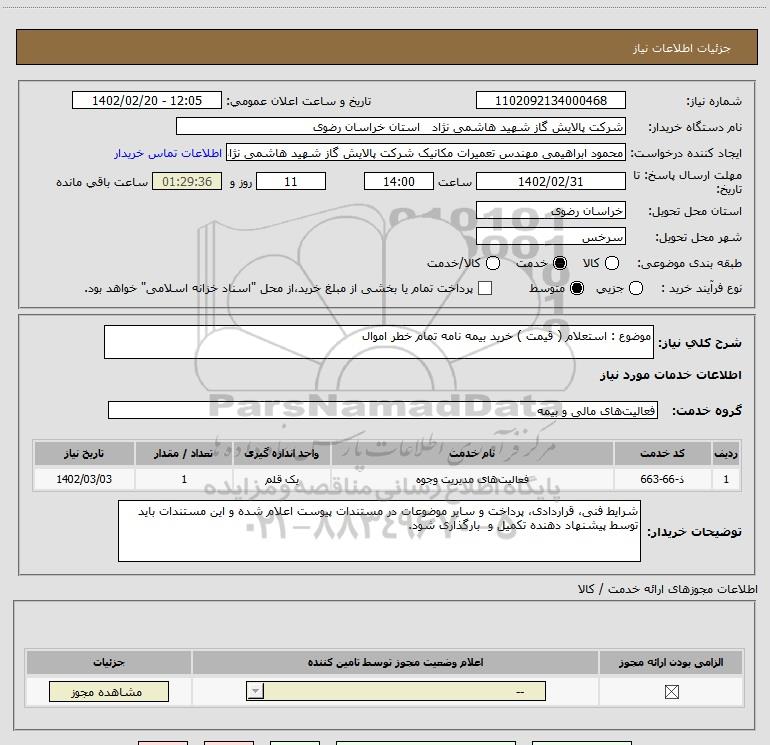 نام دستگاه خریدار:شرکت پالایش گاز شهید هاشمی نژاد استان خراسان رضوی