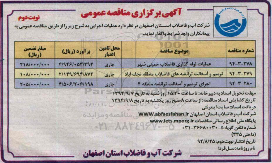 شرکت آب و فاضلاب استان اصفهان درنظردارد عملیات اجرایی به شرح زیر را از طریق مناقصه عمومی به پیمانکار واجد شرایط واگذار نماید