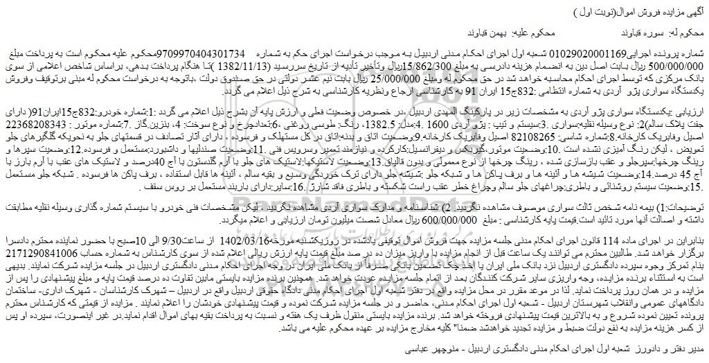 شماره پرونده اجرایی01029020001169 شعبه اول اجرای احکام مدنی اردبیل به موجب درخواست اجرای حکم به شماره 9709970404301734محکوم علیه محکوم است به پرداخت مبلغ 500/000/000 ریال بابت اصل دین به انضمام هزینه دادرسی به مبلغ 15/862/300ریال وتأخیر تأدیه از تاریخ سررسید (1382/11/13 )تا هنگام پرداخت بدهی، براساس شاخص اعلامی از سوی بانک مرکزی که توسط اجرای احکام محاسبه خواهد شد در حق محکوم له ومبلغ 25/000/000 ریال بابت نیم عشر دولتی در حق صندوق دولت ،باتوجه به درخواست محکوم له مبنی برتوقیف وفروش یکدستگاه سواری پژو آردی به شماره انتظامی :832ج15 ایران 91 به کارشناسی ارجاع ونظریه کارشناسی به شرح ذیل اعلام می گردد.