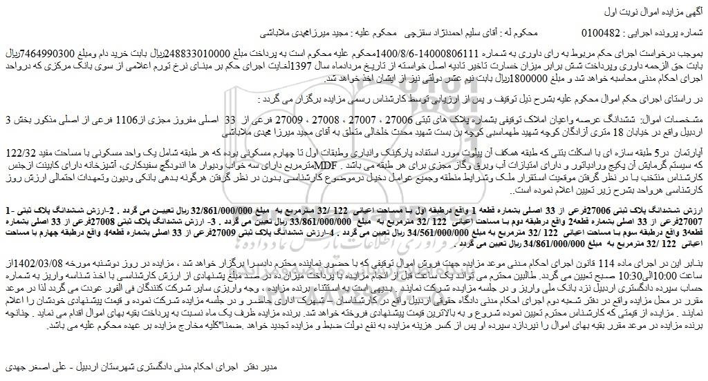مشخصات اموال: ششدانگ عرصه واعیان املاک توقیفی بشماره پلاک های ثبتی 27006 ، 27007 ، 27008 ، 27009 فرعی از 33 اصلی مفروز مجزی از1106 فرعی از اصلی مذکور بخش 3 اردبیل واقع در خیابان 18 متری آزادگان کوچه شهید طهماسبی کوچه بن بست شهید محدث خلخالی متعلق به آقای مجید میرزا محمدی ملاباشی