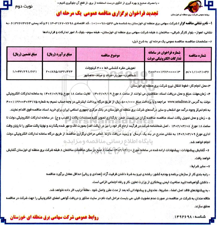 | 1021046/ 01/م | 2001001262000013 | تعویض مقره کششی خط 400 کیلوولت شمال غرب - مهزیار - میلاد و میلاد - ماهشهر | 20.865.832.424 | 1.043.291.621 |