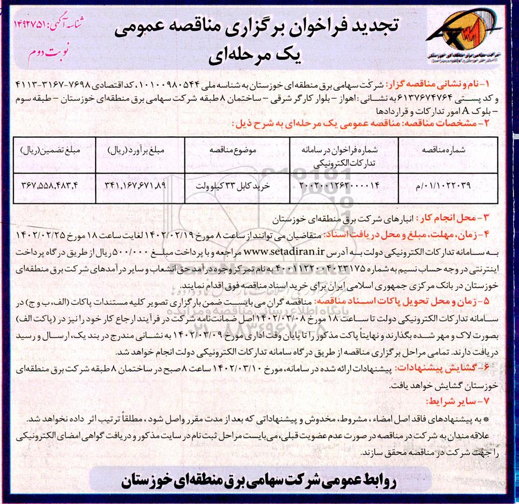 | 1022039/ 01/م | 2002001262000014 | خرید کابل 33 کیلوولت | 89.671.167.341 | 4.483.558.367 |