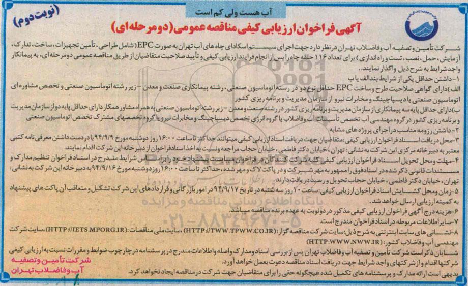 شرکت تامین و تصفیه آب و فاضلاب تهران در نظر دارد جهت اجرای سیستم اسکادای چاه های آب تهران به صورت EPC (شامل طراحی ، تامین تجهیزات ، ساخت ، تدارک ، آزمایش ، حمل ، نصب ، تست و راه اندازی) برای تعداد 116 حلقه چاه را پس از انجام فرآیند ارزیابی کیفی و تایید صلاحیت متقاضیان از طریق مناقصه عمومی دو مرحله ای به پیمانکار واجد شرایط یه شرح ذیل واگذار نماید.