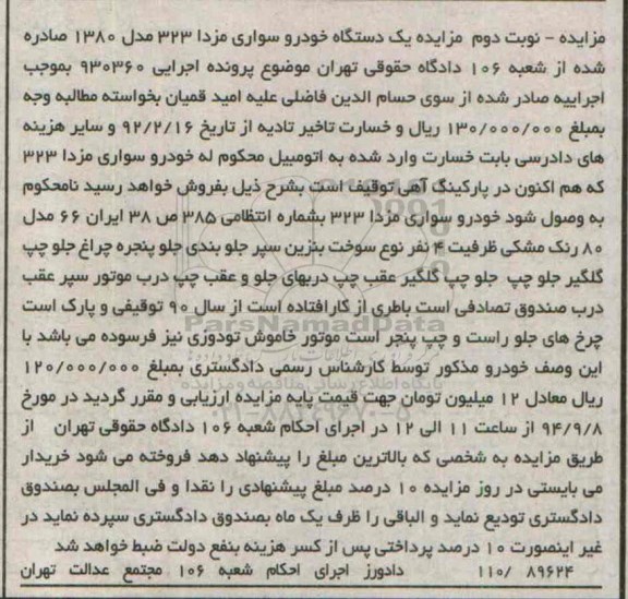 مزایده عمومی مزایده یک دستگاه خودرو سواری مزدا 323 مدل 1380 نوبت دوم برگزار میگردد. از کلیه افراد متخصص و شرکتهای واجد شرایط دعوت به عمل میآید تا در این مزایده با کد خبرگزاری پارس نماد : 581646 شرکت نمایند تاریخ شروع مزایده : 1394/08/26 مهلت شرکت در مزایده: تا پایان روز 1394/09/08 مکان برگزاری اموال واگذاری استانهای تهران و دستهبندیهای مربوط به این حراجی انواع خودرو سبک میباشد.