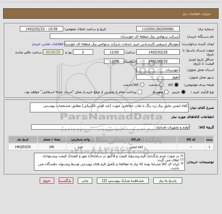 شرح کلی نیاز: کلاه ایمنی عایق برق زرد رنگ با نقاب حفاظتی صورت (ضد قوس الکتریکی) مطابق مشخصات پیوستی