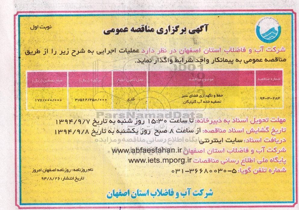 مناقصه حفظ و نگهداری فضای سبز تصفیه خانه آب گلپایگان از کلیه افراد متخصص و شرکت‌ها واجد شرایط دعوت به عمل می‌آید در مناقصه با کد خبرگزاری پارس نماد: 581950 شرکت نمایند. این مناقصه در تاریخ 1394/08/26 شروع و مهلت آن تا تاریخ 1394/09/07 میباشد.
