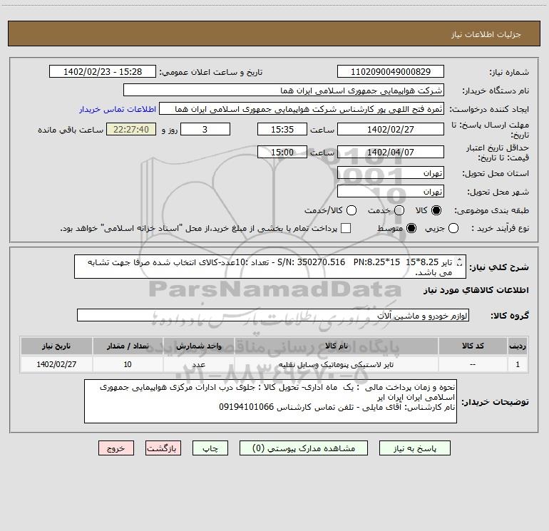 شرح کلی نیاز: تایر 8.25*15 S/N: 350270.516 PN:8.25*15 - تعداد :10عدد-کالای انتخاب شده صرفا جهت تشابه می باشد.