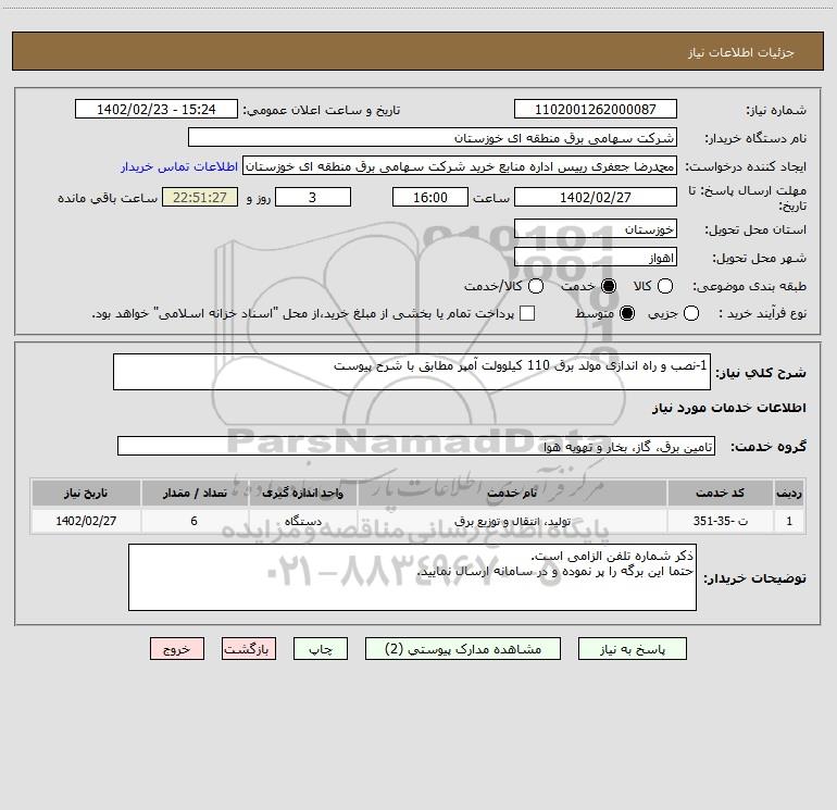 شرح کلی نیاز: 1-نصب و راه اندازی مولد برق 110 کیلوولت آمپر مطابق با شرح پیوست