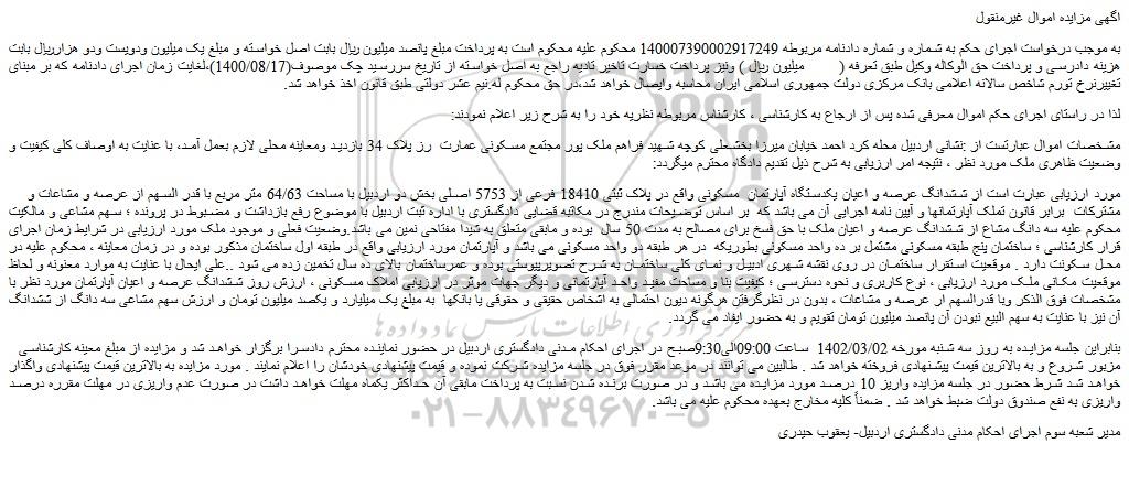 شعبه صادر کننده:شعبه سوم اجرای احکام مدنی دادگستری شهرستان اردبیل