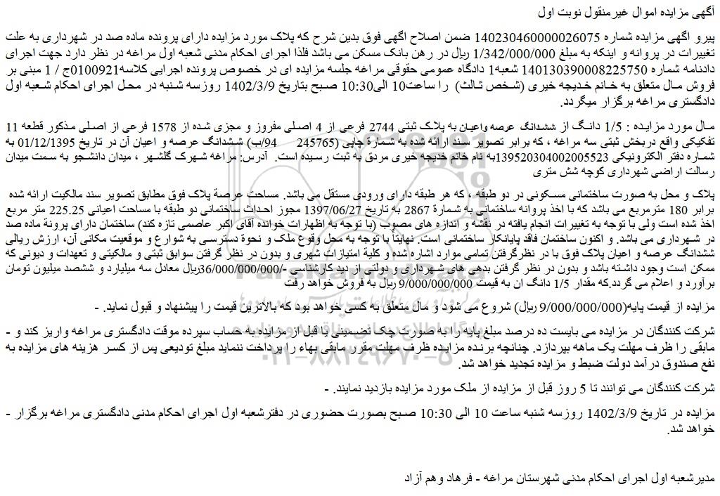 پیرو اگهی مزایده شماره 140230460000026075 ضمن اصلاح اگهی فوق بدین شرح که پلاک مورد مزایده دارای پرونده ماده صد در شهرداری به علت تغییرات در پروانه و اینکه به مبلغ 1/342/000/000 ریال در رهن بانک مسکن می باشد فلذا اجرای احکام مدنی شعبه اول مراغه در نظر دارد جهت اجرای دادنامه شماره 140130390008225750 شعبه1 دادگاه عمومی حقوقی مراغه جلسه مزایده ای در خصوص پرونده اجرایی کلاسه0100921ج / 1 مبنی بر فروش مال متعلق به خانم خدیجه خیری (شخص ثالث)  را ساعت10 الی10:30 صبح بتاریخ 1402/3/9 روزسه شنبه در محل اجرای احکام شعبه اول دادگستری مراغه برگزار میگردد.