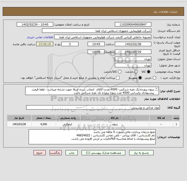 شرح کلی نیاز: زیتون پرورده تک نفره شرکتی- 4000 عدد- کالای انتخاب شده صرفا جهت تشابه میباشد - لطفا قیمت پیشنهادی براساس 4000 عدد زیتون پرورده تک نفره شرکتی باشد