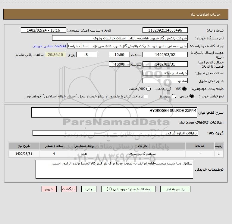 شرح کلی نیاز: HYDROGEN SULFIDE 25PPM
