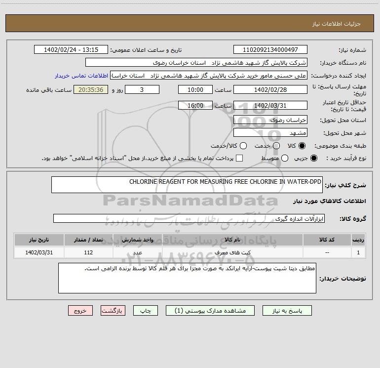 نام دستگاه خریدار:شرکت پالایش گاز شهید هاشمی نژاد استان خراسان رضوی