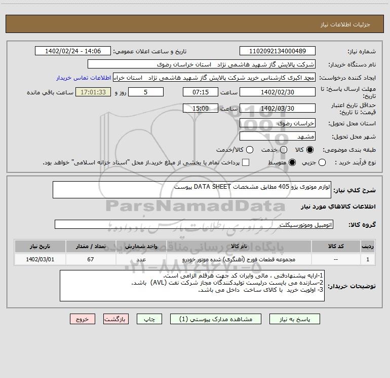 شرح کلی نیاز: لوازم موتوری پژو 405 مطابق مشخصات DATA SHEET پیوست