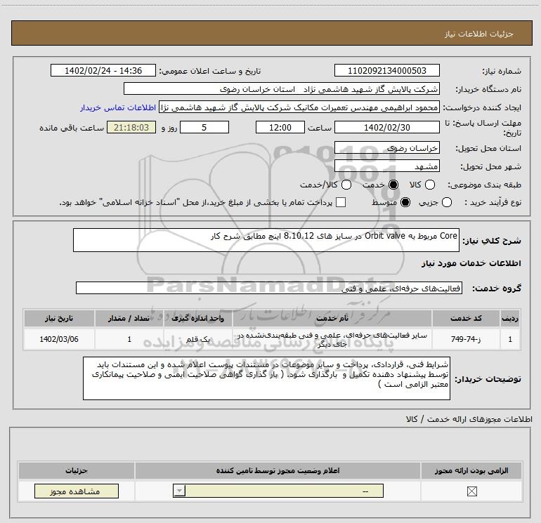 شرح کلی نیاز: Core مربوط به Orbit valve در سایز های 8،10،12 اینچ مطابق شرح کار