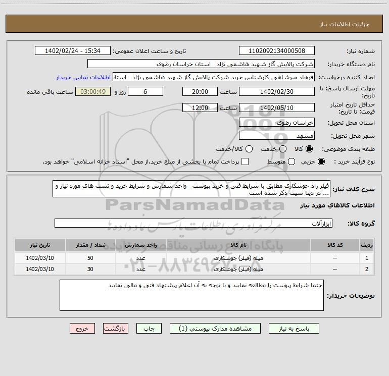 نام دستگاه خریدار:شرکت پالایش گاز شهید هاشمی نژاد استان خراسان رضوی