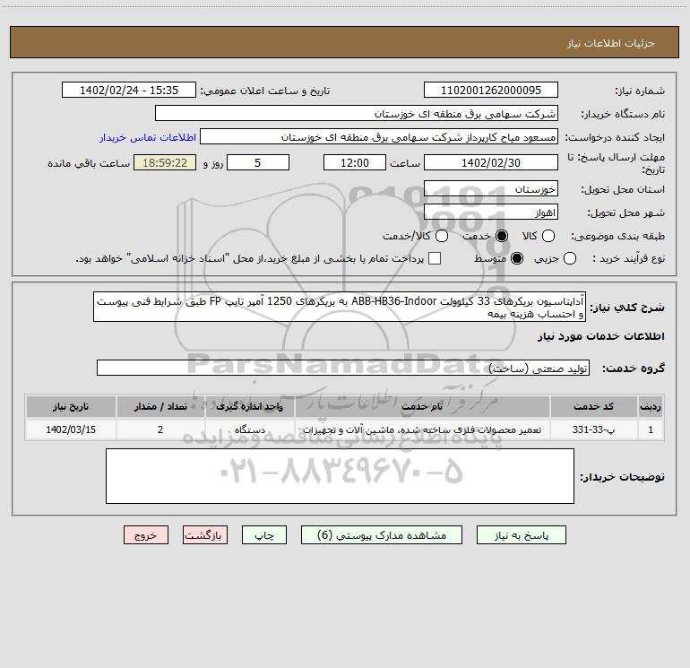 شرح کلی نیاز: آداپتاسیون بریکرهای 33 کیلوولت ABB-HB36-Indoor به بریکرهای 1250 آمپر تایپ FP طبق شرایط فنی پیوست و احتساب هزینه بیمه