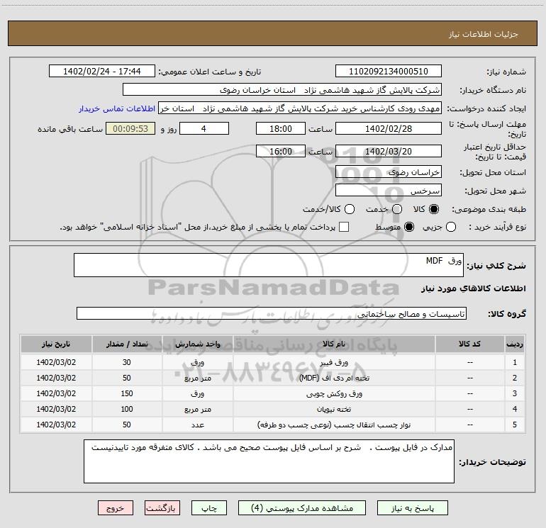 | 2 | -- | تخته ام دی اف (MDF) | متر مربع | 50 | 1402/03/02 |