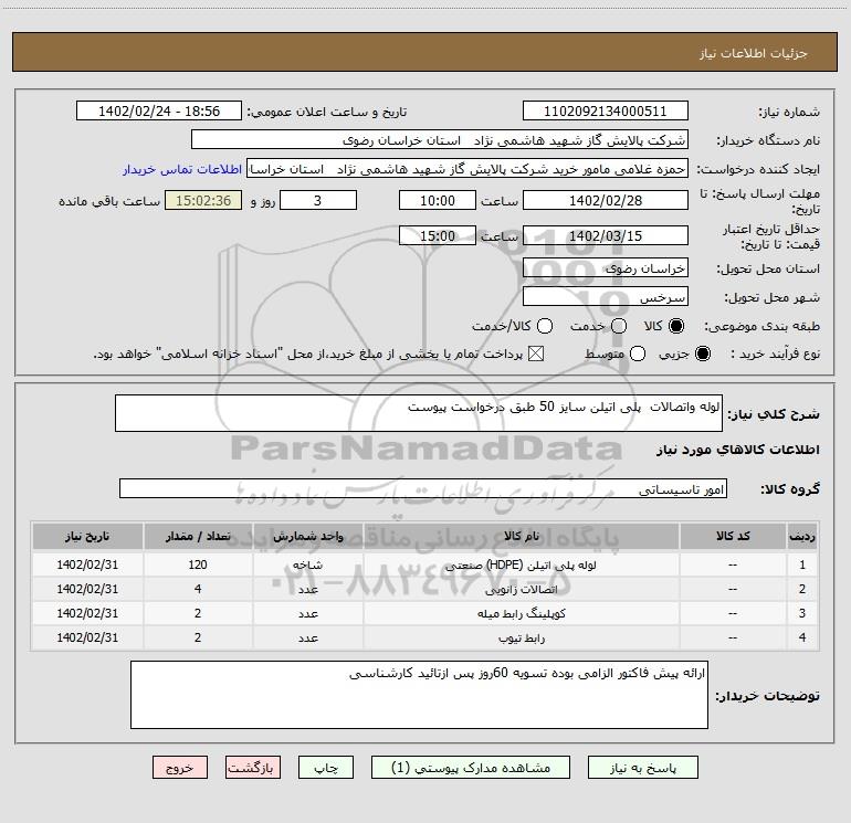 شرح کلی نیاز: لوله واتصالات پلی اتیلن سایز 50 طبق درخواست پیوست